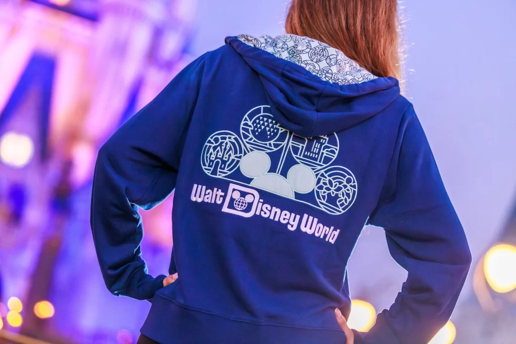 Com base azul e detalhes super coloridos, ela traz crewnecks (moletom de gola redonda), camisetas, orelhas, mochila e vários acessórios cheios de elementos gráficos divertidos. Cada peça parece contar uma história diferente do seu dia mágico!