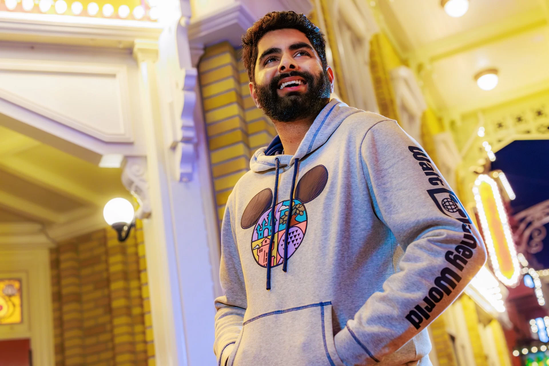Com base azul e detalhes super coloridos, ela traz crewnecks (moletom de gola redonda), camisetas, orelhas, mochila e vários acessórios cheios de elementos gráficos divertidos. Cada peça parece contar uma história diferente do seu dia mágico!